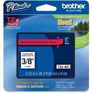Laminated tape features standard adhesive designed for smooth, flat surfaces like office paper, file folders and binders. These labels stay on under normal indoor and outdoor use, including hot and cold environments. Use with Brother P-touch Labelers using TZ or TZe tapes. They include GL-100, PT-1000, PT-1000BM, PT-1010, PT-1010B, PT-1010NB, PT-1010R, PT-1010S, PT-1090, PT-1090BK, PT-1100, PT1100SB, PT-1100SBVP, PT-1100ST, PT-1120, PT-1130, PT-1160, PT-1170, PT-1180, PT-1190, PT-1200, PT-1230PC, PT-1280, PT-1280SR, PT-1280VP, PT-128AF, PT-1290, PT-1290BT, PT-1290BT2, PT-1290RS, PT-1300, PT-1400, PT-1500, PT-1500PC, PT-1600, PT-1650, PT-1700, PT-1750, PT-1800, PT-1810, PT-1830, PT-1830C, PT-1830SC, PT-1830VP, PT-1880, PT-1880C, PT-1880SC, PT-1880W, PT-18R, PT-18RKT, PT-1900, PT-1910 and PT-1950. Print color is black. Background is red. Tape measures 9mm (0.35") wide x 8m (26-1/5') long. | |